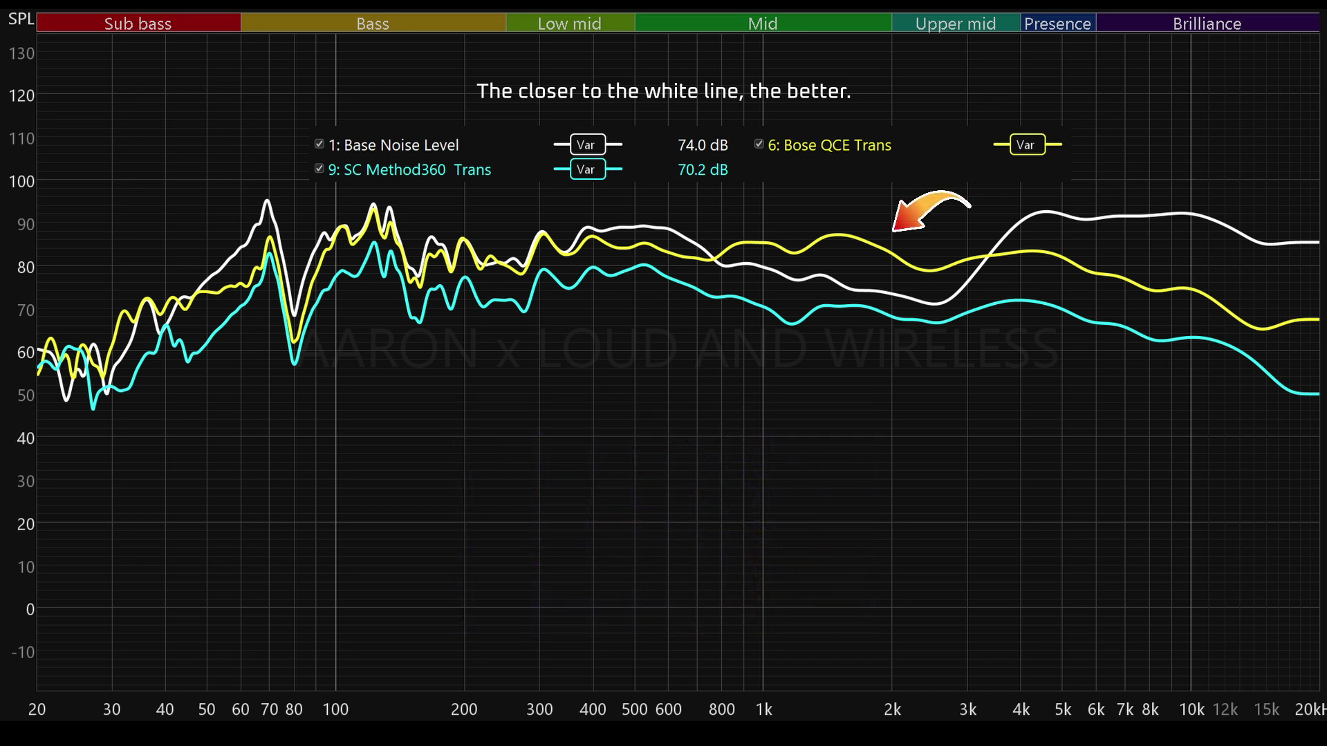 In terms of transparency, the Skullcandy is simply not as clear or transparent as the Bose. The white line in this chart represents a regular ambient noise level which is like not wearing any earbuds at all. You can see that the Bose is a lot closer to it, sometimes amplifying more than the natural ambience between 780-3khz, which is great for voice passthrough. The Skullcandy on the other hand is going to muffle your own voice during verbal exchanges, so not as transparent as the Bose QCE.