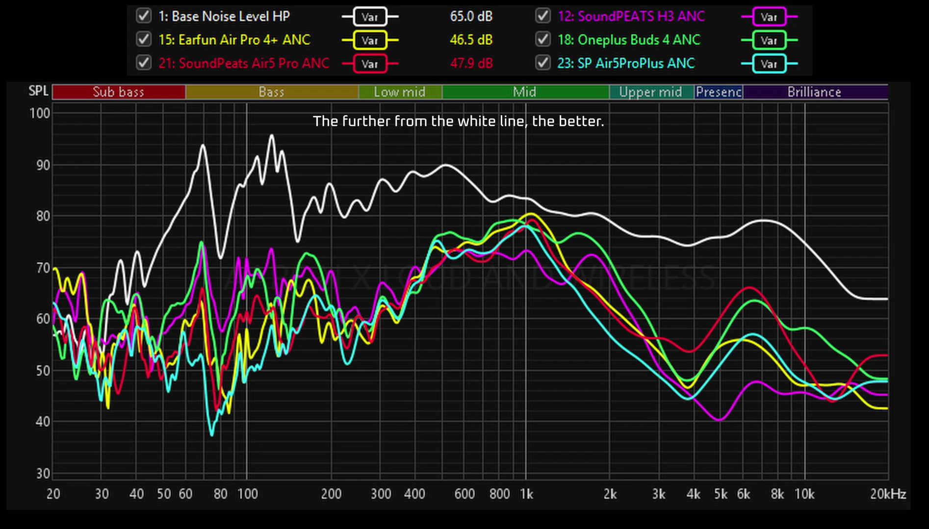 In terms of active noise canceling, the Air5 Pro+ has different noise canceling modes, but we’re going to compare them based on its default Adaptive mode which I found to be the most effective. Based on these measurements, its ANC performance is one of the most powerful in this comparison. It is a little quieter than the Earfun Air Pro 4+, and it cancels more high frequency noise than the previous model.