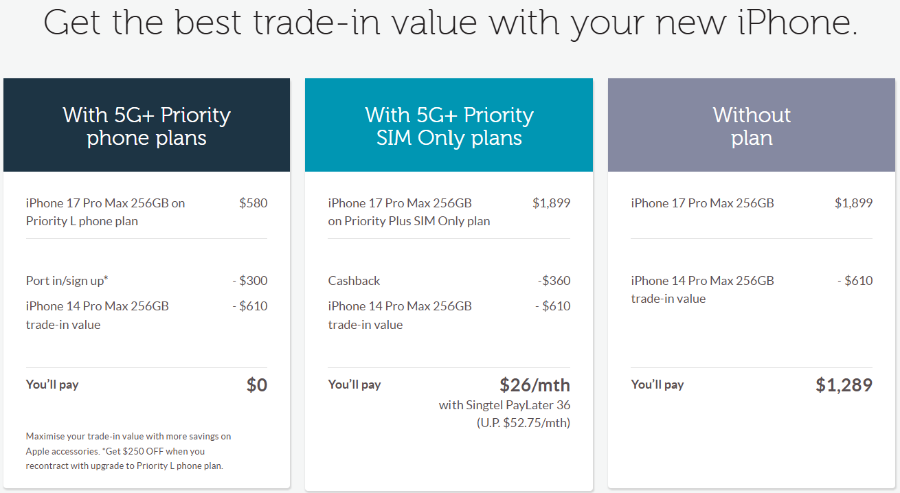 For example, a user who signs up for a Priority Plus plan with 36-month Singtel PayLater instalment plan and chooses the iPhone 17 Pro Max 256GB ($1,899) gets an immediate $360 cashback. That works out to monthly handset instalments of $42.75 per month (instead of $52.75 per month.