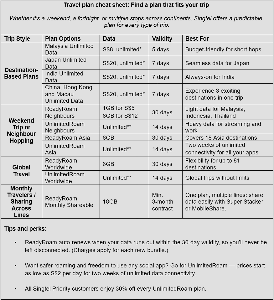 • Want safer roaming and freedom to use any social app? Go for UnlimitedRoam — prices start as low as S$2 per day for two weeks of unlimited data connectivity.